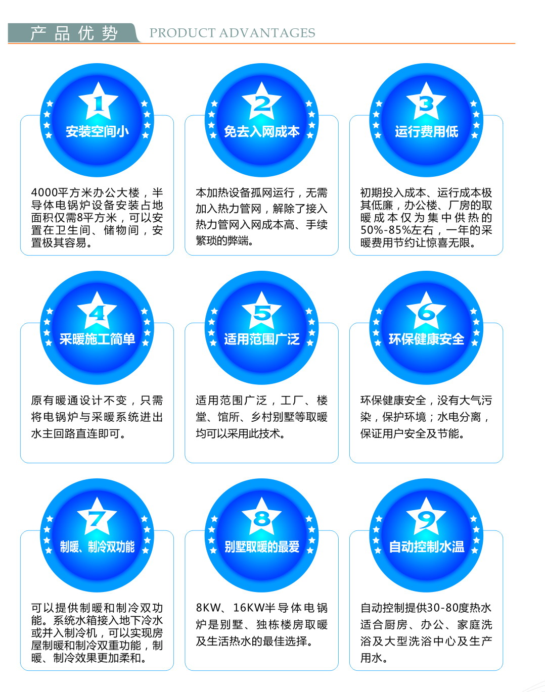新紀元集團在研發(fā)鐵路熱處理設備、淋雨設備過(guò)程中,積累了豐富的快速加熱技術(shù)、水流控制技術(shù)。在集團冬季取暖無(wú)法得到社會(huì )保障的特殊情況下,大膽地把快速加熱技術(shù)、水流控制技術(shù)及PLC自動(dòng)化控制技術(shù)應用到暖通技術(shù)上,針對北方廠(chǎng)房、辦公樓取暖的特殊情況,研究開(kāi)發(fā)了半導體電鍋爐。在集團內部使用過(guò)程中,體會(huì )到其巨大的成本、環(huán)保、控制方便的優(yōu)勢;遠離了接入社會(huì )管網(wǎng)入網(wǎng)成本、運行成本高、手續繁瑣的弊端,運行效果讓公司驚喜無(wú)限;同時(shí)受到了房地產(chǎn)公司和社會(huì )中小企業(yè)的極度青睞,試制初期就定制出了數百臺半導體電鍋爐。公司據此投入了一條自動(dòng)化的電鍋爐生產(chǎn)線(xiàn)及配套暖通設備生產(chǎn)線(xiàn),具備年產(chǎn)半導體電鍋爐5000臺的生產(chǎn)能力,為北方企和樓堂館所提供了環(huán)保的春天,歡迎使用新紀元電鍋爐設備,必定讓您驚喜無(wú)限!